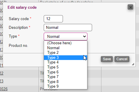 In order to get the correct output to Dataløn, you need to specify for each salary code, which information you need to get into your export file. This is setup by selecting the correct type for the salary code, when editing salary codes.