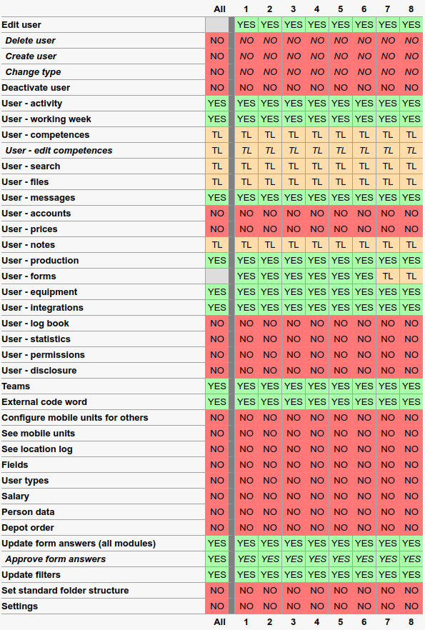 - User - Working week: Allows you to specify who has access to the tabs "Competences" and "Working Week" on users