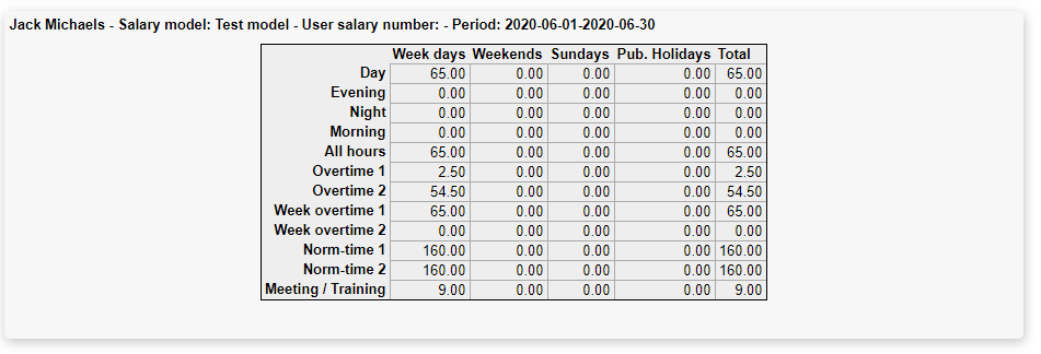 The hour summary shows, for each user, how their hours are divided between day types and hour categories. This view can be useful to identify exactly which hours are needed for a certain salary code.