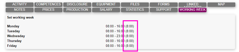 Normal time is the time a employee is expected to work, and is configured under the user. The normal time is highlighted below: