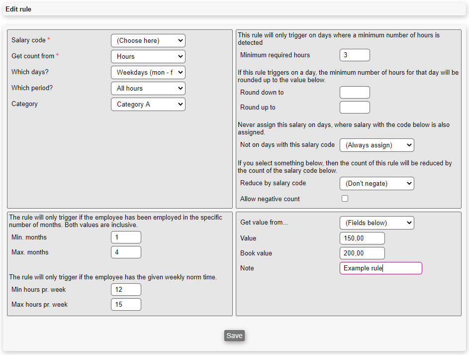 - Min/max hours pr. week: This will calculate the weekly normal time of the user, and the rule will only trigger, if the result is within the given limits. If left empty the rule is always triggered.