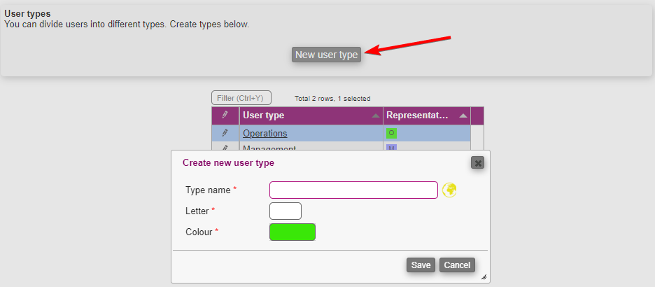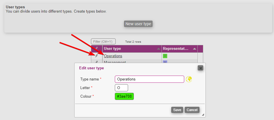 Editing a user type happens in the same menu. Just click on the pencil or directly on the title to enter edit mode.
