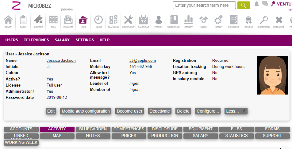 The user card is accessed either by the menu MY PROFILE or through the USER > SEARCH where you will find all the users in your system.