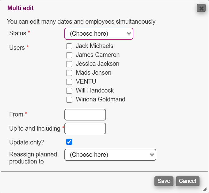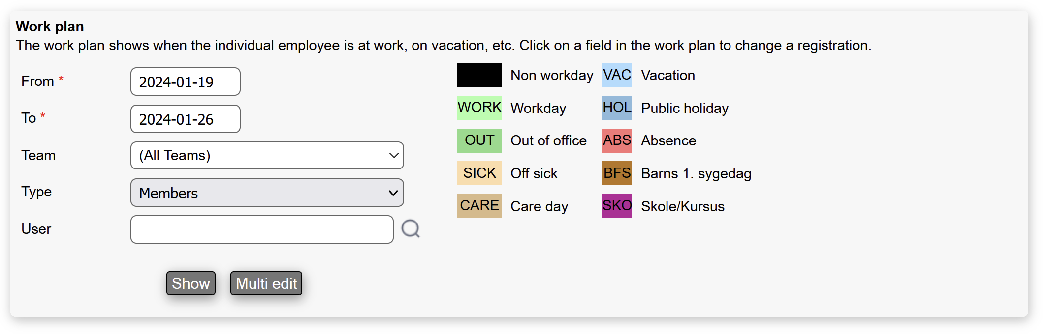 You can simultaneously edit many dates and employees by pressing the "Multi edit"-button. It enables you to select several employees and dates with the same registration, at the same time. This is very beneficial when managing several users at a time, e.g. holidays and vacations.
