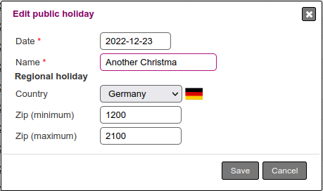 Regional holidays allow you to specify that a holiday only applies to a range of post codes in a given country.