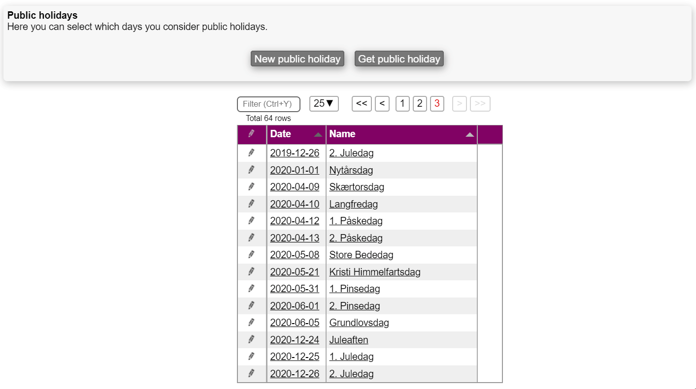 By pressing the "Get public holiday"-button you are able to retrieve future public holidays, requiring you only to provide the system with at least a From year date, while the To year date is entirely optional. You can also edit or delete the existing ones by pressing thebutton to the left of each holiday.