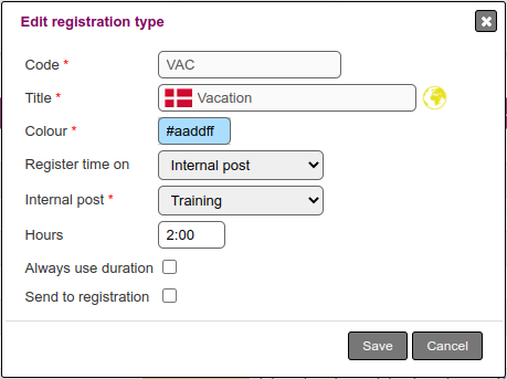Send to registration: (only for automatic time registration) Check this, if you want automatic time registration to work on days of this type